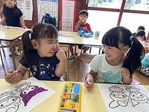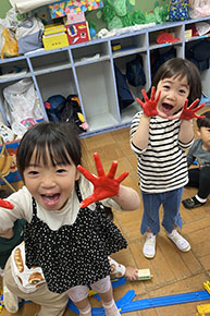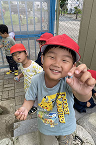笑顔から「共感」の楽しさが・・・(年少組) 言葉以上の楽しさを伝えあえる友達とのつながり・・。貴重な友達とのふれあいタイムです。 |