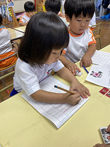 ワークを始めました(年少組) 背中真っすぐ、鉛筆を握り、真剣に横線を引きます。 |