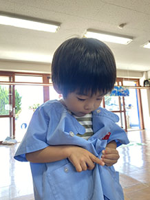 自分でできるよ!(年少組) どの子もやりたくない、でも、自分でやらなければならないボタンかけ。かけ違いのずれがないように、下から慎重にかけています。 |