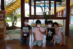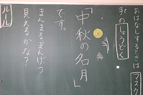 | 9月21日、各クラスの黒板には、“十五夜ですよ”とお知らせしてありました。 年長クラスには「中秋の名月」と書いてありました。 ホールにすすきとお花が飾ってありました。お団子15個ずつ作って飾りました。 | 園長先生が朝礼の中で十五夜のお話しをして「お団子は何個お供えするの?」と子どもたちに問いかけました。 |