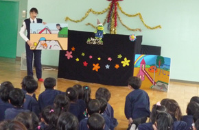 上尾警察署・埼玉県警察のおまわりさんのご指導を受けました。おまわりさんが人形劇で、どんな甘い誘惑にもついていかないことを教えてくださいました。