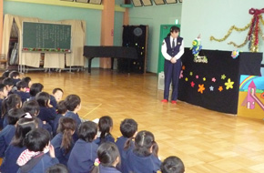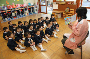 訓練前に3歳児は絵本をとおして先生から具体的に訓練の意味を教えていただいています。