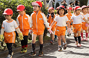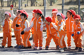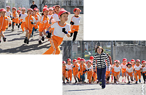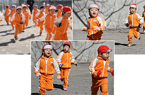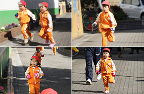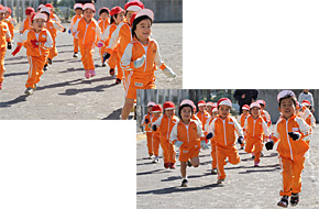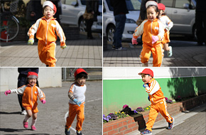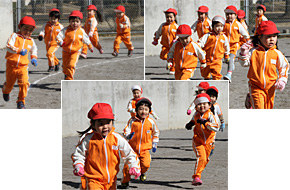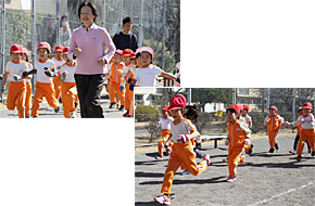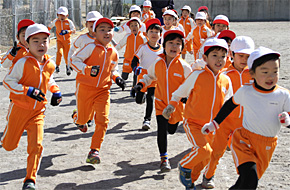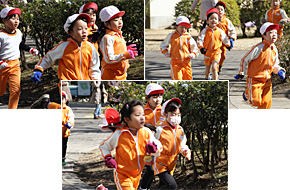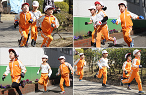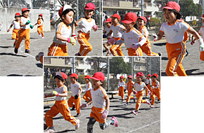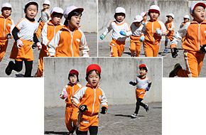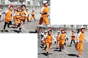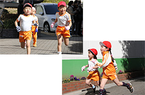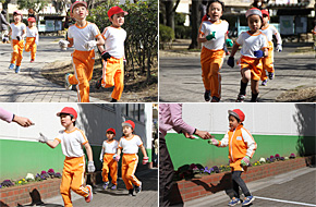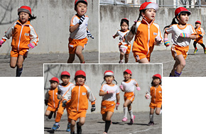 | ゴールまであと少し、頑張れ!頑張れ! | もも組 走ることが楽しい年少組です。 |