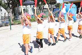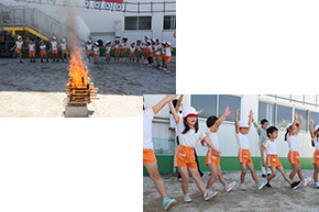 | ♪遠き山に日は落ちて…の音楽にのせて火の子のお友だちの入場です。 | |