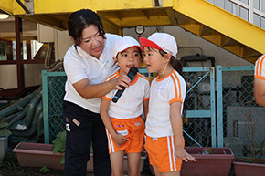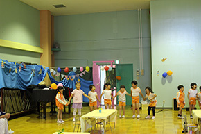 「やっほっほ夏休み」「おばけなんてないさ」をみんなで歌いました。! さあ2学期の始まりです。 運動会、発表会…楽しいことが盛りだくさんの2学期です。 遊びを通してあんなことができちゃった!こんなことができちゃった!実りある2学期にしていきましょうね♪ |