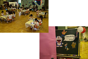 「おなかすいた~!!」 体育館の入り口には『どこでもドア~!』カレーのいい匂い♪ 「いらっしゃいませ~ドラえもんレストランへようこそ☆ |