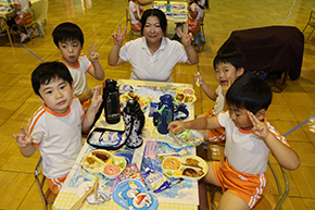 | いつもとは違う雰囲気の幼稚園♪ みんなで食べるカレーはおいしかったね! デザートのバニラアイスはひんやり~! |