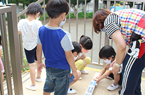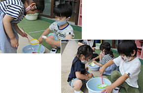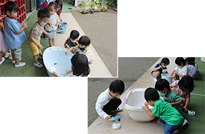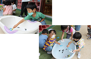 | さかなつりを楽しみました♪水に触れることでその感触を楽しみ、心地よさを味わいます♪ | ボクも~ワタシも…と、お友だちがどんどん増えていきます。「気持ちよさそうだね~」と子どもの想像力はとても豊かです。みんな仲良し♪ |