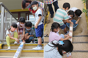 | 何をつくっているのでしょうか・・・ 年長さん♪ | スライダーですね!みんなで意見を出し合い、協力しながら作りました! |