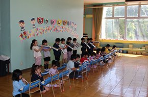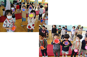 年長組によるメロディオン「きらきら星」と歌「今日からともだち」です。 年長さんにかっこいい~!年中さん、年少さんのお友だちも体を動かしてリズムに乗ってくれました。 |