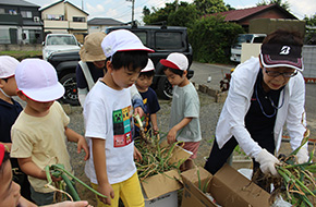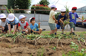よいしょ!よいしょ!一生懸命働く子どもたち。みんなで植えたねぎの成長が楽しみですね。 きっと甘くておいしいねぎができますよ♪ |