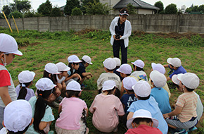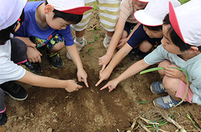 | 先日植えた大豆やかぼちゃのお話。園長先生は畑博士!先生たちも勉強になることばかりです(笑) | 「あ!虫の幼虫だ!」 自然界に住む虫も子どもたちにとっては大切な教材です。そっと土の中に戻してあげました。 |
