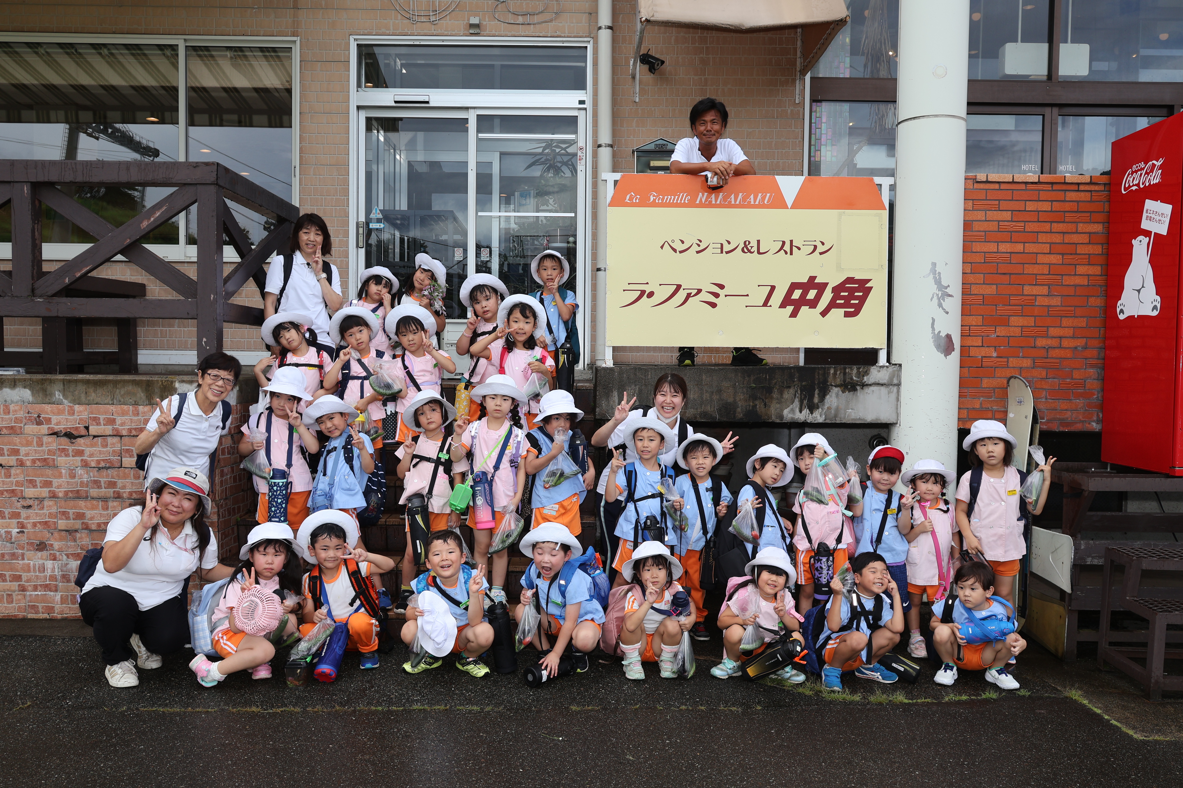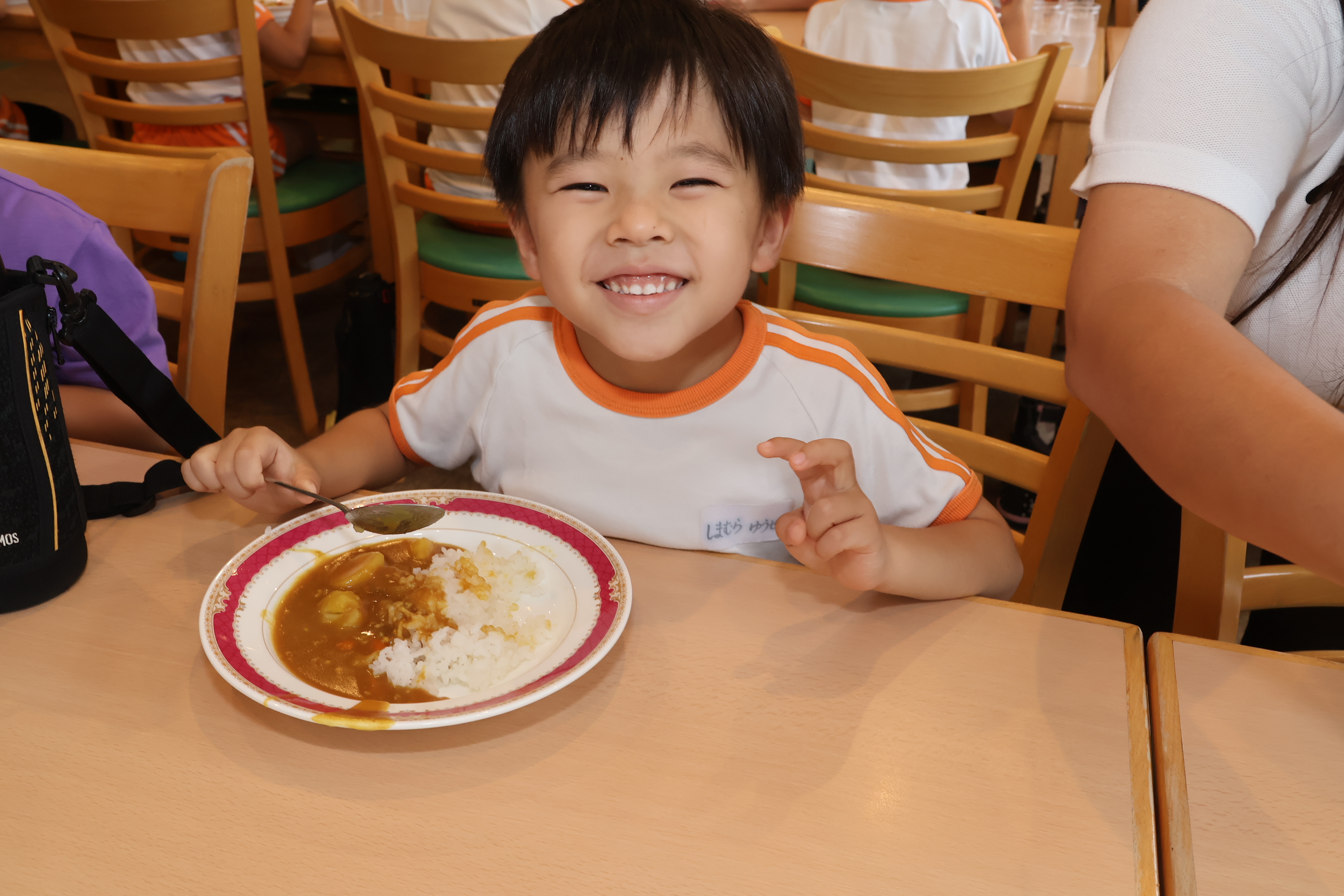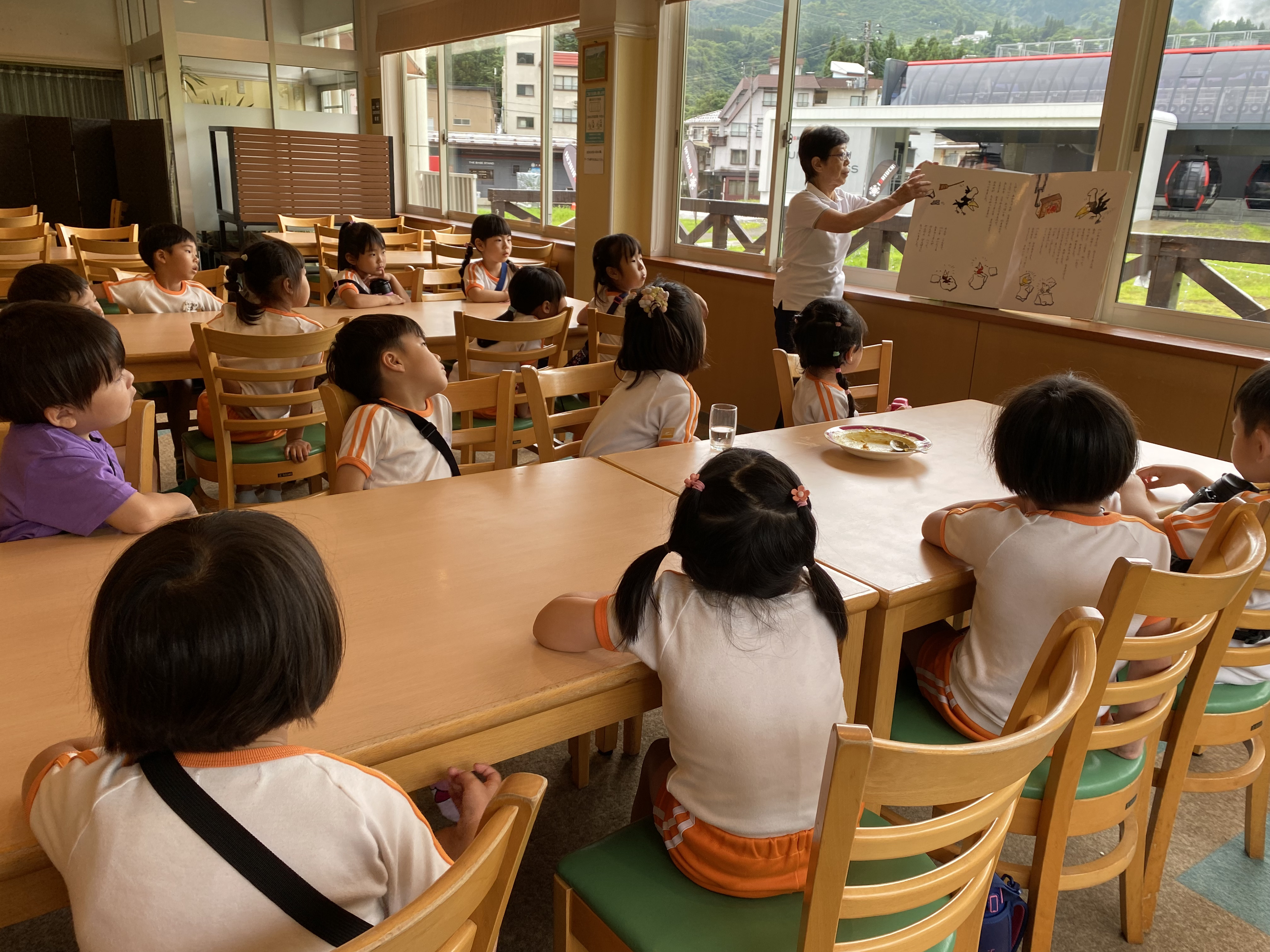 | 「ラ・ファミーユ中角さん」で名物のカレーをいただきました♪ トロトロに煮込まれた地場野菜と新潟県魚沼市のコシヒカリ! 「おいしい~!」全員がおかわりをしておなか一杯頂きました。 | カレーを頂いた後はお腹休め♪園長先生の大型紙芝居タイムです。 窓の向こうには緑豊かな山々…とても居心地の良い時間を過ごしました。 | |