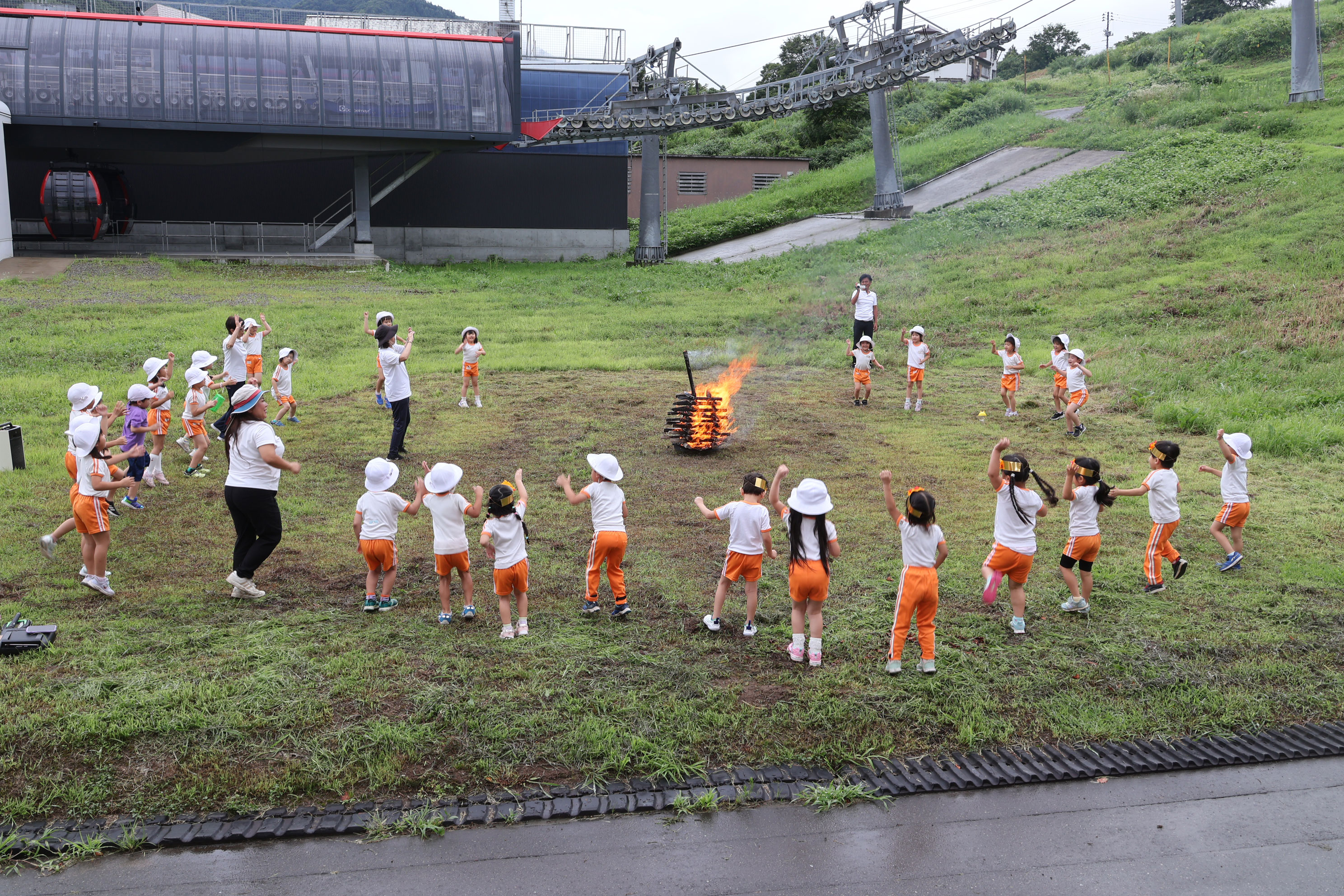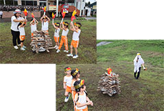 | 「キャンプファイヤーの儀」 キャンプファイヤーの様子です♪火の子の先導で火の神様が火を灯してくださいます。 火の粉のセリフ…「水を大切にします、火を大切にします、自然を大切にします、命を大切にします。」 |