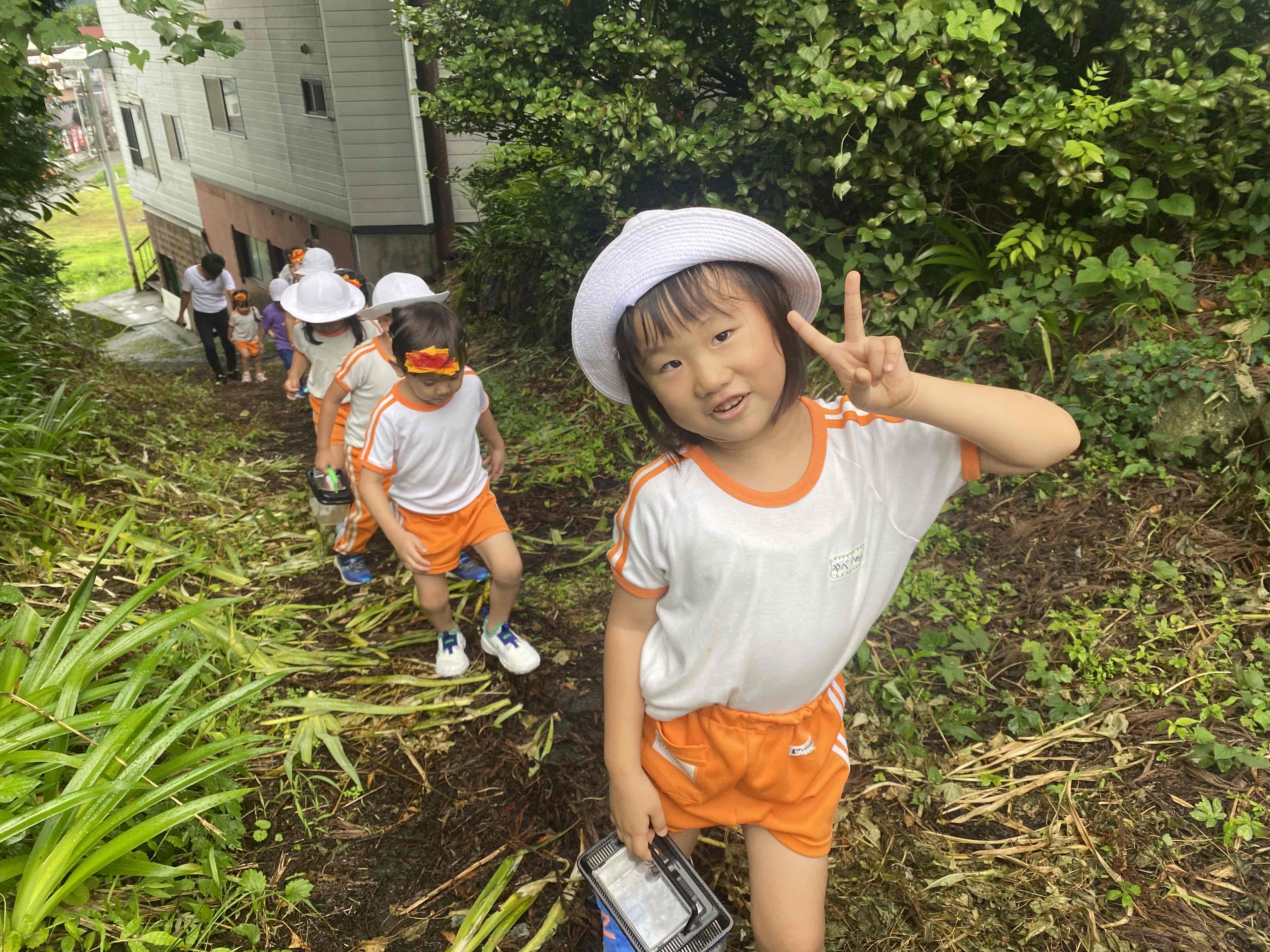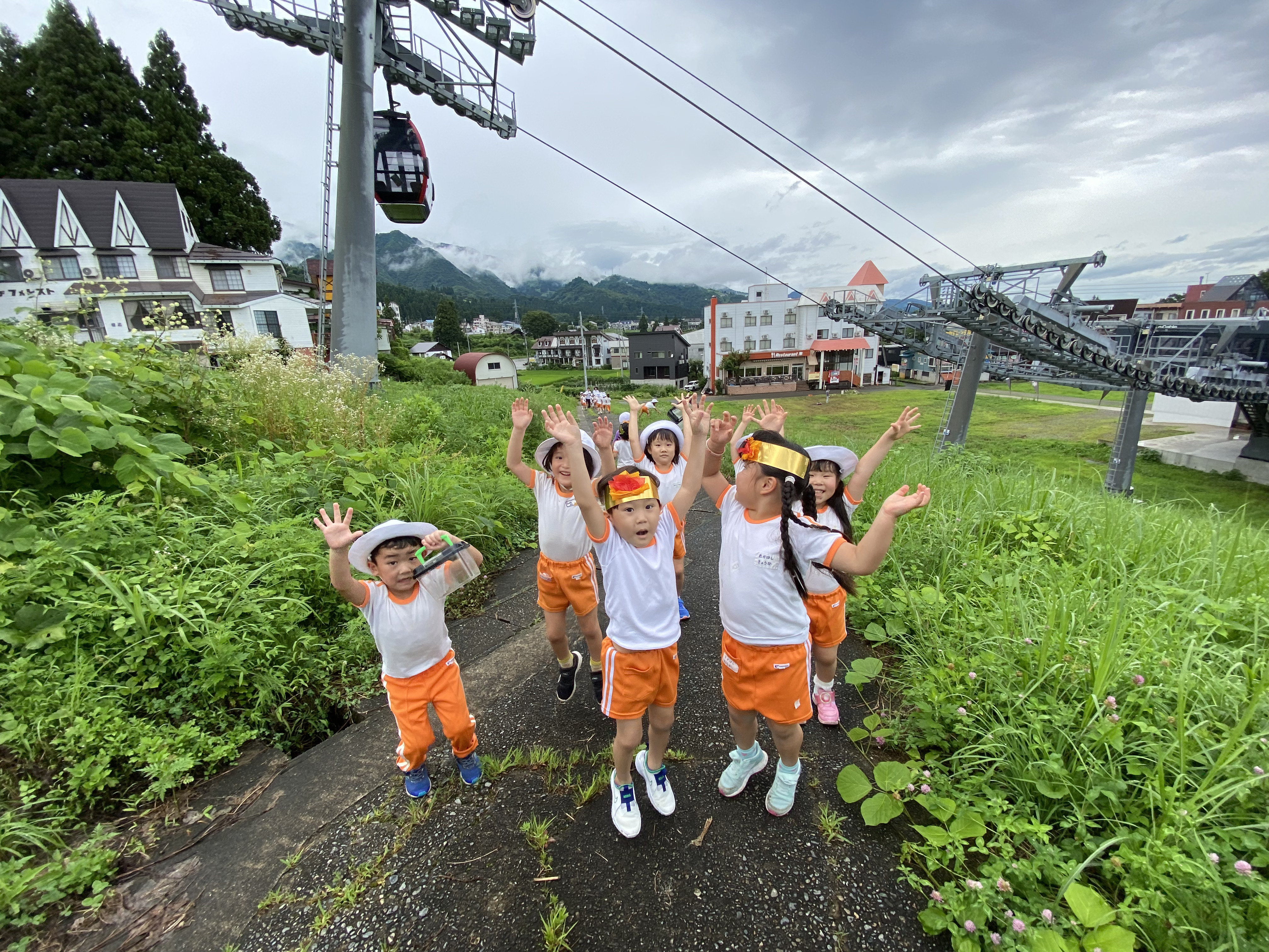 | やっほー!!山の上の空気がとってもおいしかったです♪ 「せんせい~お山に雲がかかっているよ!」 大人にとっては当たり前のような光景も子どもたちにはすべてが不思議!発見!驚き~! なのですね♪ | ||