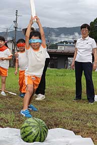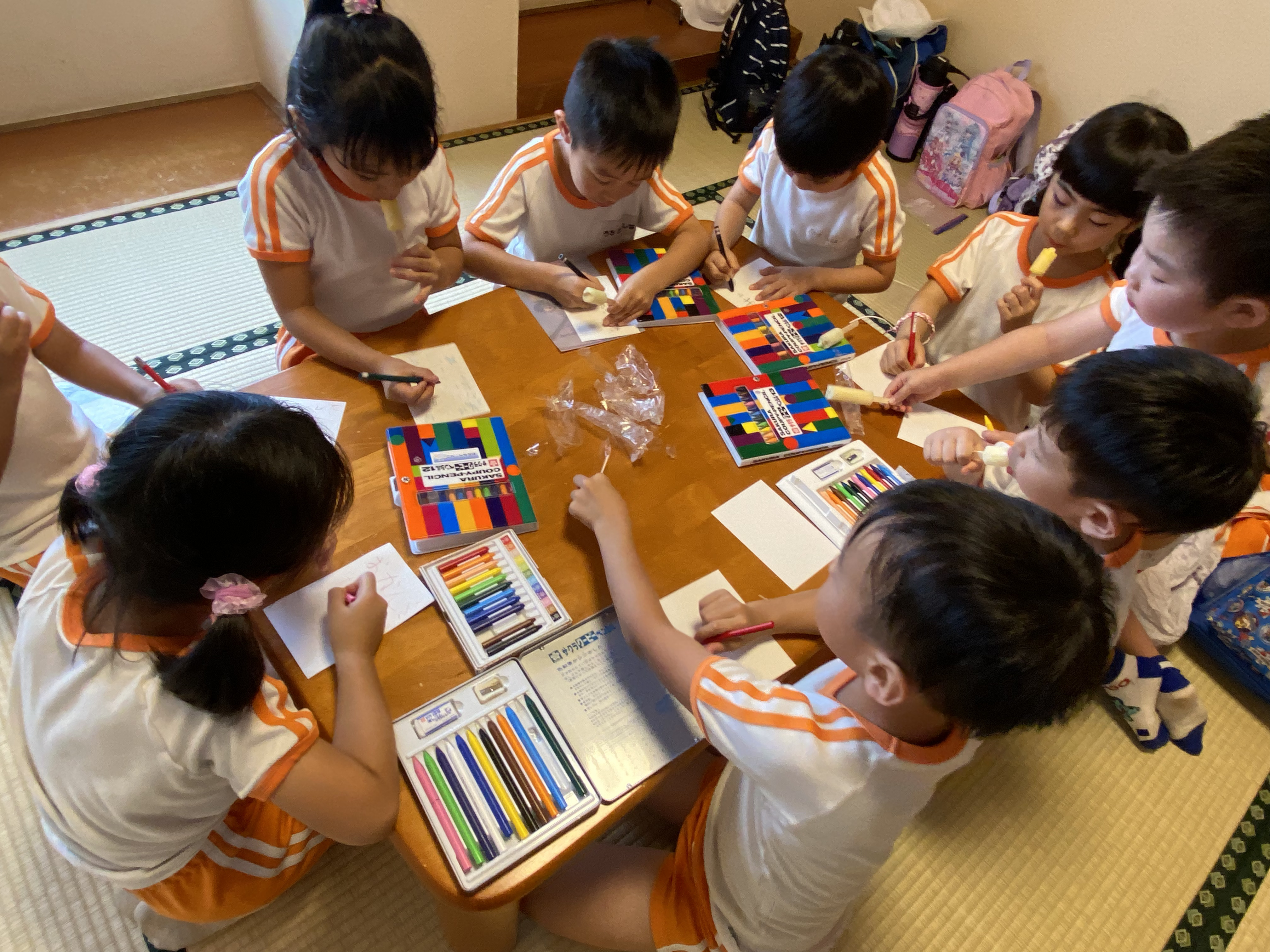 | 山登りの上はスイカ割り大会! 右~!左だよ~!大変盛り上がりました♪ | おうちの方に絵葉書を描きました♪ | |
