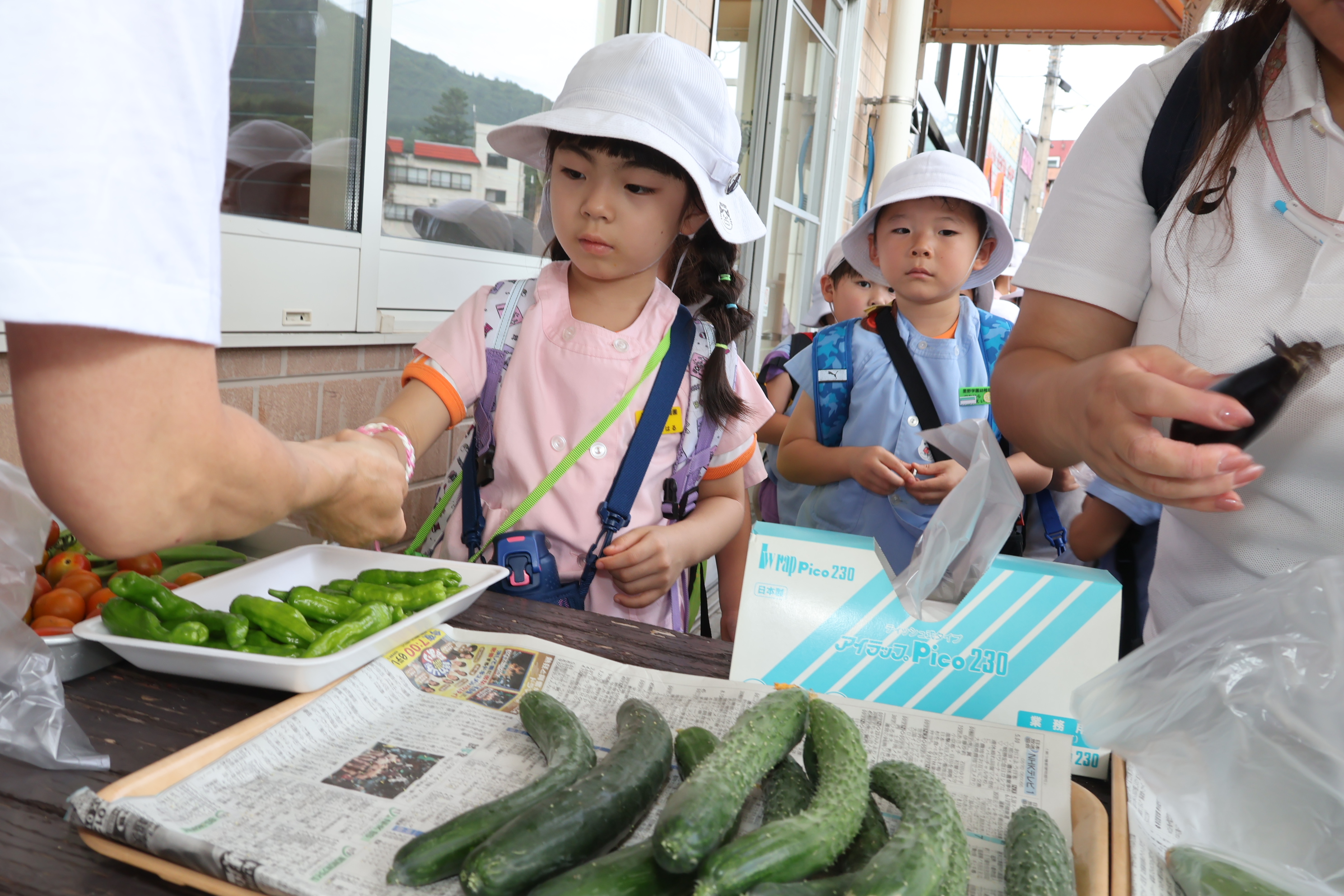 | 夕市の様子♪ 1人200円のお小遣いで朝採れ野菜をおうちの方にお土産に… お買い物楽しい~! |