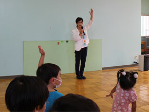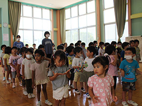 今日の園長先生からのお話は…1学期の「頑張ったで賞」の発表でした。 日頃の行いや頑張ったことや努力したことを認め、褒めみんなに大きな拍手をもらい嬉しそうな子どもたちなのでした。 |