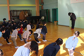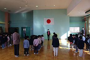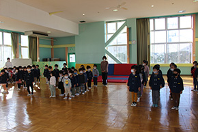 | 2学期終業式です。 人数を分散して行いました。 「2学期はたくさんの挑戦ができましたね」と園長先生よりお話をいただきました。一人ひとりが頑張ったこと、みんなで頑張ったこと、色々な形での挑戦がそれぞれの成長につながった2学期でした。 | 話を聞く姿も、背筋が伸び、とても立派でした。 |