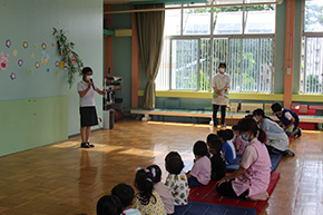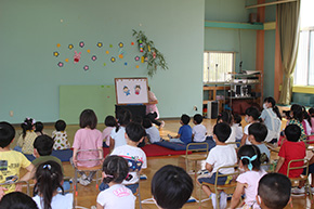 | 全学年で七夕コンサートを行いました♪ 近隣の方のご厚意で立派な笹を頂き、子どもたちは短冊や輪つなぎなどを飾りました。 | 七夕のお話しをパネルシアターで見て、みんなで「たなばたさま」の歌を歌いました。 |