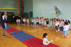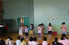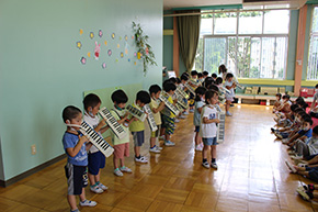 | 年少組さんは、カスタネットで「ありさんのおはなし」を披露しました。カスタネットのリズム打ちと振付もかわいらしく発表しました。 | 年中組さんは、メロディオンで「メリーさんのひつじ」を立奏しました。年少、年長組さんからたくさんの拍手に嬉しそうでした。 |