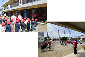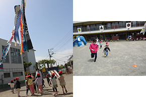| 早々に恒例の週に1度の集会が始まりました。園長先生のお話はしっかり聞けたかな? 「上を見上げて見てみましょう!」園長先生からの声かけに「うわぁ~!すご~い!おっきなこいのぼり!」子どもたちの歓声♪ 星野学園幼稚園は季節の行事や四季折々の移り変わりを大切にし、子どもたちひとりひとりの感性を大切にしています。 |