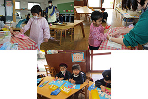 | 年少組さん♪ 初めての絵の具にドキドキわくわく!どんな作品に仕上がるかな!? 粘土コネコネ♪さあ何ができるかな? |