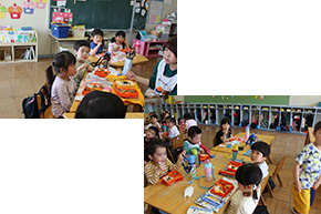 給食の様子。「よく噛んで食べましょうね♪」先生からの声かけにうなずく子どもたち。みんなで食べるとおいしいね!食べるときの姿勢や箸やスプーンの持ち方に気を付けています。また、無理のない範囲で食の指導にも力を入れています!食べることって大事ですね! |