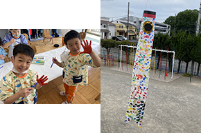 星野学園幼稚園全員の手型で大きなこいのぼりを作りました! ほしのっ子こいのぼりの完成です!風にたなびく姿は圧巻ですよ! |