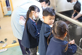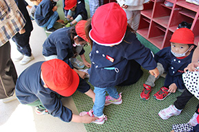 年長組のお友だちは心の優しい子ばかりです。年少さんの靴を履かせてくれていました。 思い起こせば2年前…今の年長さんも年少組の頃お兄さんおねえさんにお手伝いしてもらっていましたね。アットホームな雰囲気の当園ならではの縦割り保育なのかもしれません。 |