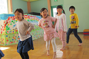 | トイレや手洗いの仕方なども学びます。みんな上手にできていますね♪ | 年長組のリトミックの様子です♪ 四分音符、二分音符、八分音符、全音符を手足で表現します。ピアノのメロディーに合わせると楽しいですね♪ |