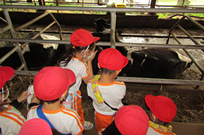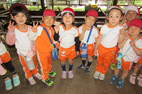 年長組のお友だちは上尾市にある「榎本牧場」に」行ってきました! お腹に赤ちゃんのいる牛を観察したり、豚や小動物などを真近で見ることができました! さあ、幼稚園に帰ったら大きな画用紙に動物の絵を描いてみましょうね。 |