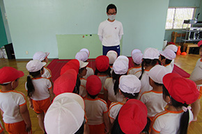 | 園長先生から…動物の近くに行くと「くさい!」という子どもたちがたくさんいました。そんな中、園長先生がお話をしてくれました。「みんなもおトイレに行くよね?牛さんも豚さんも同じですよ」と。真剣な表情の子どもたち。生きている動物を目の前に「命の尊さ」を改めて学ぶことができました。 | ヨコミネ式スポーツでは気合十分の子どもたちです! 「はいっ!」と良いお返事。きっとこの1年で、できなかったことが「できた!」に変わりますよ。 |